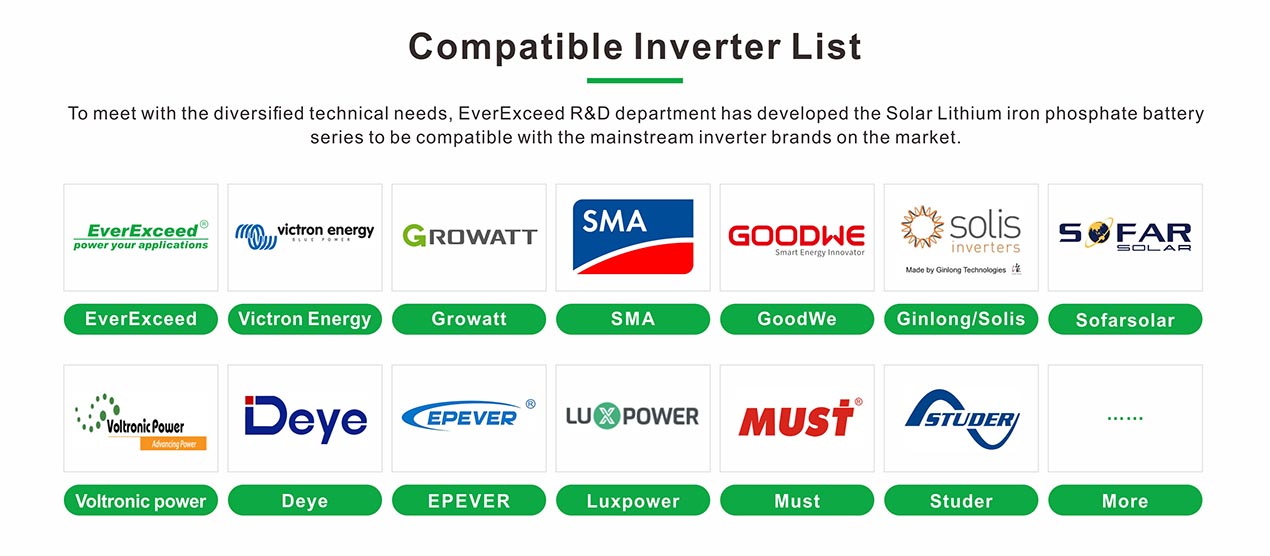 Compatible: CAN/RS485/RS232 Communication Protocol Lithium Ion Battery can be compatible with most inverters in the market, such as Growatt, Deye, SunGoldPower, Luxpower, Victron energy, Schneider, Phocos, SMK and so on.