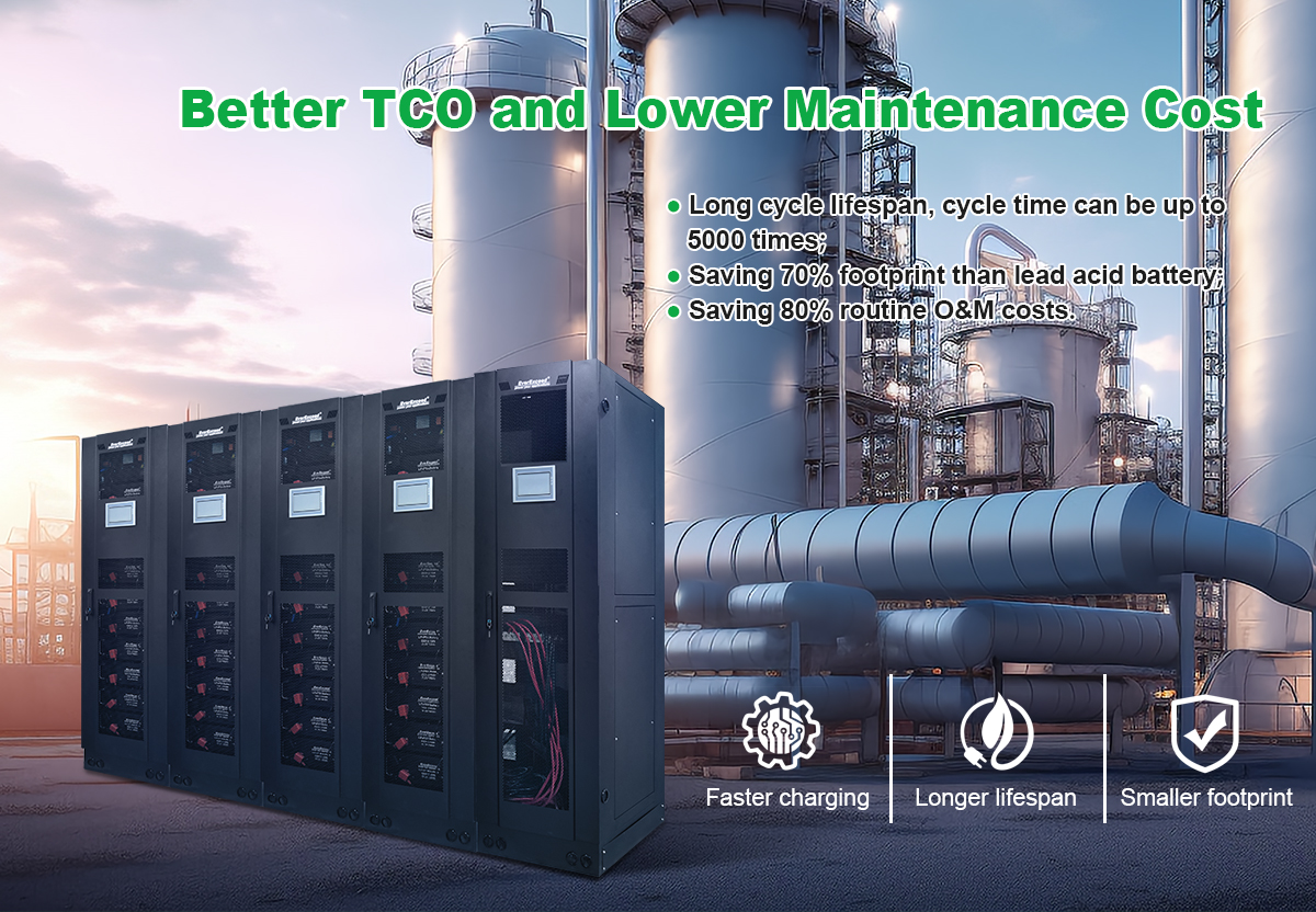 Achieve better TCO with up to 5000 cycles, 70% space savings, and 80% lower maintenance costs compared to lead-acid batteries.