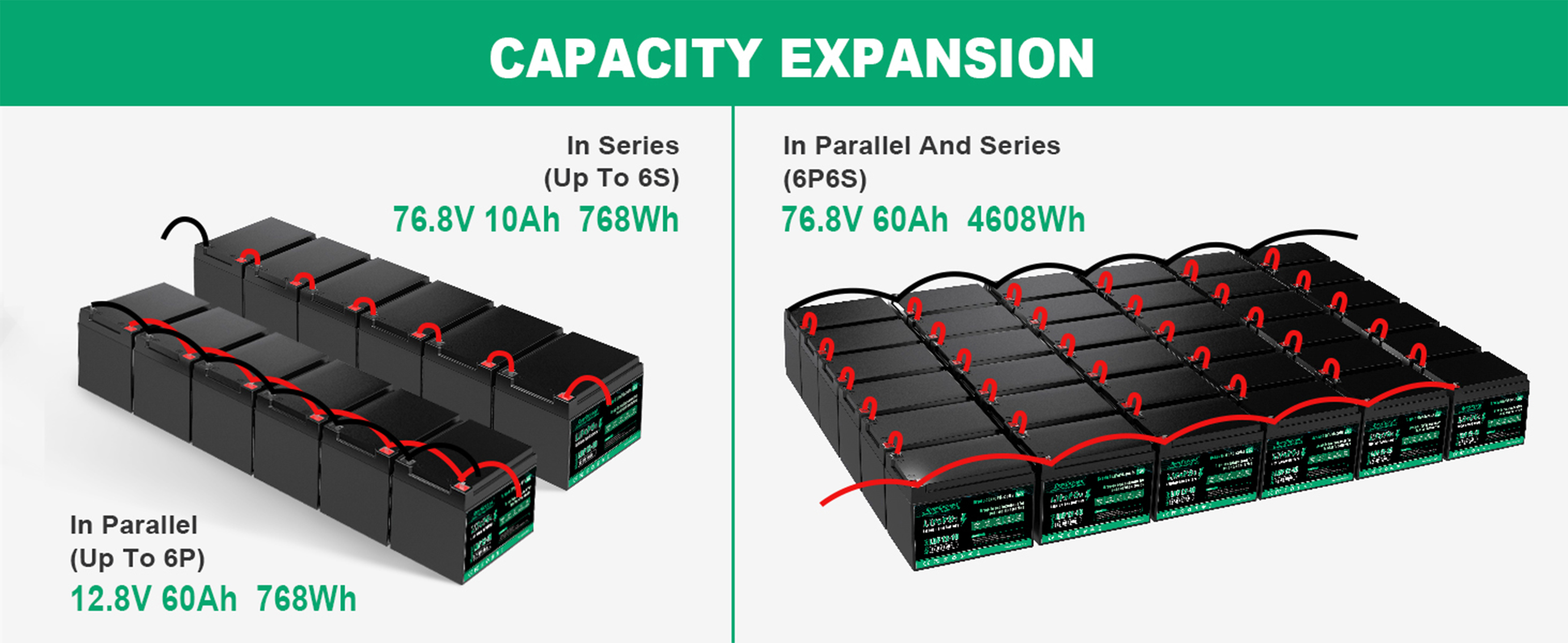 -- Max series up to 51.2V. That is, the 12.8V battery can be 4 strings, and the 25.6V battery can be 2 strings. The maximum number of parallel connections should not exceed 4.