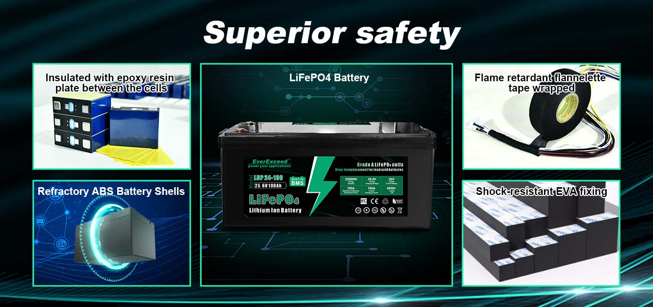 --We use lithium iron phosphate batteries,with no fire, no explosion, wide operating temperature range,which can ensure the safety of use.