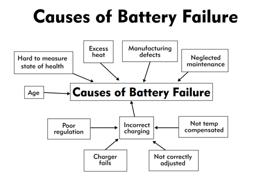 1. Failure to replenish water on time: Since recharge is not 100% efficient, some recharge energy electrolyzes water molecules of the electrolyte into hydrogen and oxygen gas that exit the battery through vent caps. If neglected long enough, failure to replenish lost water causes the battery’s plates to go dry, causing permanent loss of capacity.