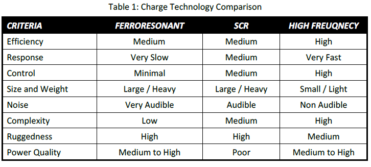 The selection of the appropriate charger technology depends mainly on the battery requirements and the applications needs. Although ferroresonant and SCR chargers have been in existence for many years and are quite durable and reliable, the performance benefits of high frequency battery chargers can outweigh those of ferroresonant and SCR types.