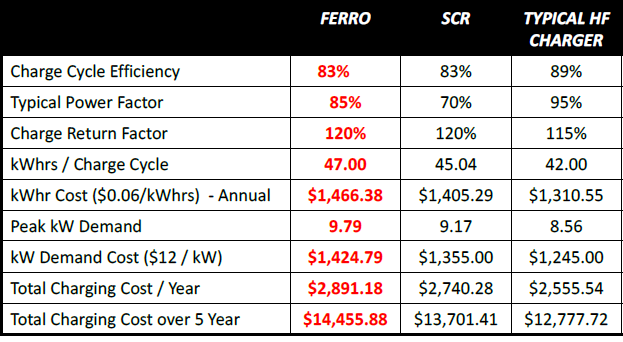 Consider a typical application utilizing a 36V, 1000Ahr battery operating for two shifts per day with daily EBU usage of 2.0 (two shifts with 80% DOD in each shift). The table below summarizesthe energy costs of a ferro, SCR, typically HF chargers.