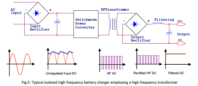 A typical high frequency battery charger incorporates a front-end AC-DC rectifier to generate anunregulated DC input voltage, a high frequency (HF) power converter that converts input DC input a high frequency AC voltage, a high frequency isolation transformer to provide output isolation as well as voltage step-down function, and an output rectifier and filtering stage to generate a smooth, very low ripple output DC voltage (see Fig. 5). Pulse Width Modulation
