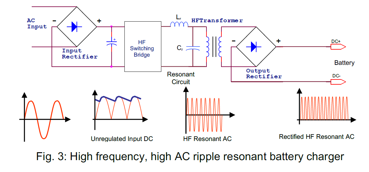 One abnormal example of high frequency chargers available is the high frequency, high ripple, resonant chargers used by EverExceed. These chargers utilize a high frequency resonant power conversion stage, where a resonant circuit is used to generate high frequency resonant voltage and/or current waveforms (Fig. 3).