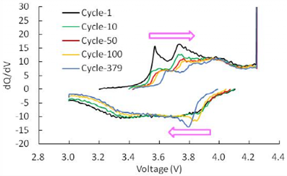 Charge and discharge the lithium-ion battery, and record the charge and discharge parameters, especially the power and voltage data. After obtaining these data, the data will be processed first. We subtract the voltage and power data from the n+1th data point. With n data points of voltage and power data, we get a dV and dQ data. After processing all the data in turn, we get a series of dV and dQ data, and then we divide dQ by dV to get another one Data dQ/dV, then we use dQ/dV as the ordinate and voltage, capacity or SoC as the abscissa, we get a standard dQ/dV curve, as shown in Figure 6.