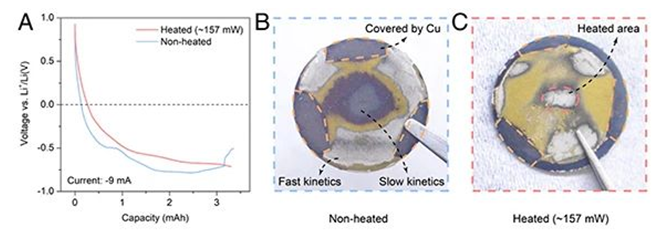 Based on the study of Li-Cu batteries, the author hopes to prove that Li-graphite batteries can also undergo a lithium evolution reaction at a potential higher than 0 V (vs. Li0/Li+). In order to minimize the effects of kinetics, the researchers reduced the applied constant current to -10 mA (approximately C/25). The three voltage platforms in Figure 4B correspond to different lithium insertion stages of graphite. At the last stage of the third voltage platform, the heating device is turned on (Figure 4C), and the battery voltage increases rapidly due to the increase in the balance electrode potential and the reduction over potential. Then as the graphite lithium intercalation reaction continued, the voltage began to drop. When the voltage drops to 25 mV, the slope of the voltage curve drops significantly (as shown in Figure 4E), which is completely different from the unheated graphite charging curve, which may mean that lithium ions begin to deposit and precipitate lithium metal. When the voltage drops to 15 mV, the applied current is removed (the gray arrow in Figure 4B). At this time, the voltage suddenly increases to 72 mV due to the increase in the concentration of lithium ions between the graphite particles and in the electrolyte. This is due to the dissolution of lithium and the further intercalation of lithium in the incomplete intercalation part between graphite layers. After the voltage stabilizes to 85 mV, the constant current is reapplied for a period of time and then removed again, cyclically. During the whole process, the potential of the graphite electrode always remains above 0 V (vs. Li0/Li+). It can be seen from the temperature curve in Figure 4D that the temperature change trend of the system is very similar to that of the Li-Cu electrode. The reason for the temperature drop is the heat dissipation caused by the deposition of lithium metal. When the applied current is removed, the dissolution and the further intercalation of lithium between the graphite layers make the temperature of the battery rise. After the experiment, the precipitation of metallic lithium can also be seen in the central area of the graphite pole piece, confirming that the uneven temperature distribution inside the battery can indeed cause the graphite anode to undergo lithium precipitation at a potential higher than 0 V (vs. Li0/Li+) reaction.
