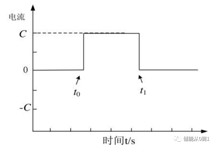 After the end of the discharge process, the voltage of the battery will rebound due to the existence of polarization. The DC impedance measurement is to calculate the internal resistance of the battery by using the voltage difference between the voltage at the moment before the end of discharge and the voltage after the end of discharge. Specifically, the battery is discharged with a constant current of size I, as shown below: