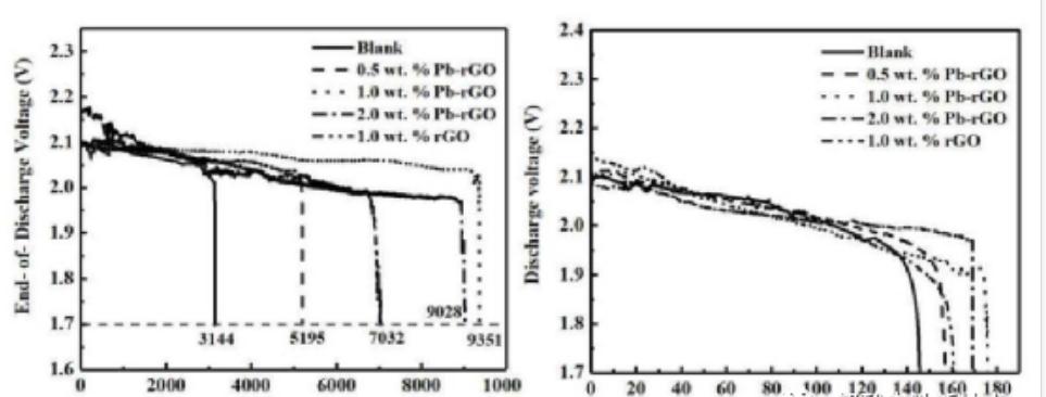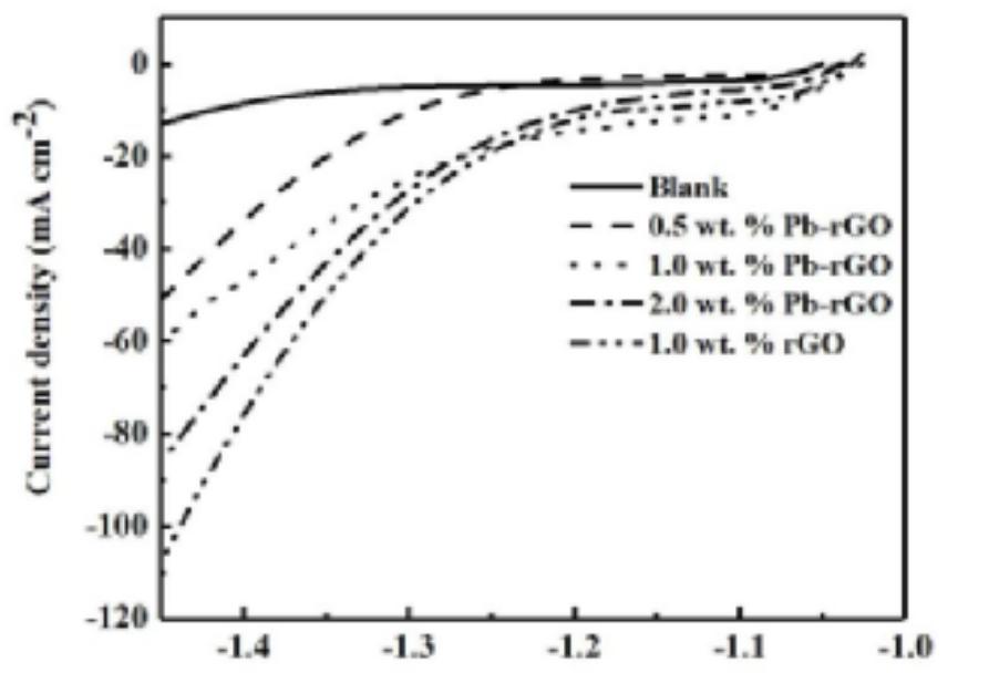 The cathodic polarization curve of Pb- rGO in the electrolyte prepared by an electrochemical test system is studied. The results are shown in Figure 1. Compared with the blank negative plate (without rGO and Pb- rGO), the current density of hydrogen evolution reaction increases with the increase of Pb- rGO added. Moreover, for the same amount of addition, the addition of rGO causes the highest current density of hydrogen evolution reaction, which proves that the prepared PbrGO has higher hydrogen evolution overpotential than the corresponding rGO, which effectively prevents the side reaction of hydrogen evolution on the negative plate of the battery during charging, and improves the cycle life of the battery.
