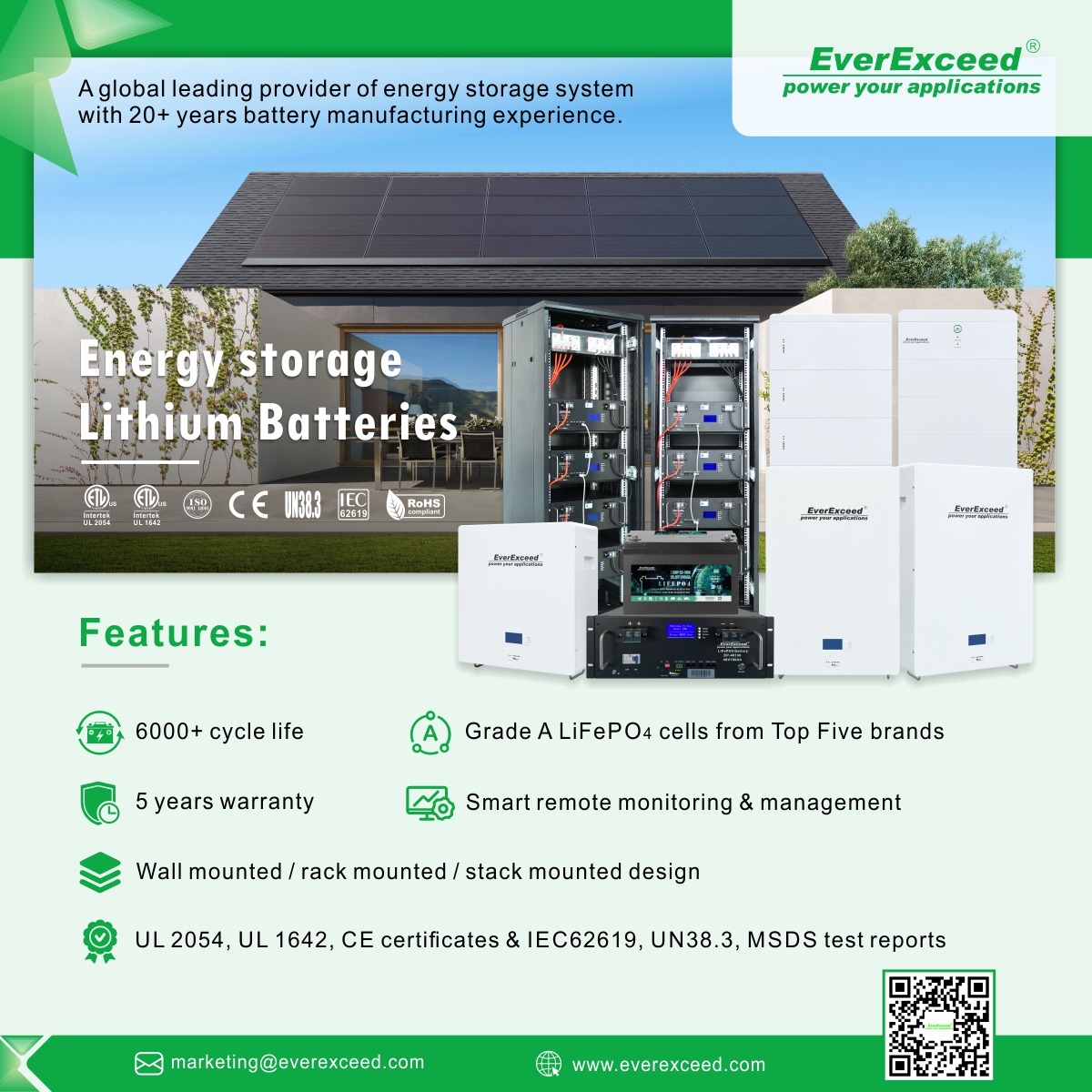 EverExceed is a global leading provider of energy storage system with 20+ years battery manufacturing experience. It focuses on residential energy storage market with all kinds (wall/rack/stack type) of storage batteries. If you have any requirements or any kind of query regarding the Battery Energy Storage System for your desired applications, feel free to communicate with our dedicated team at any time at marketing@everexceed.com
