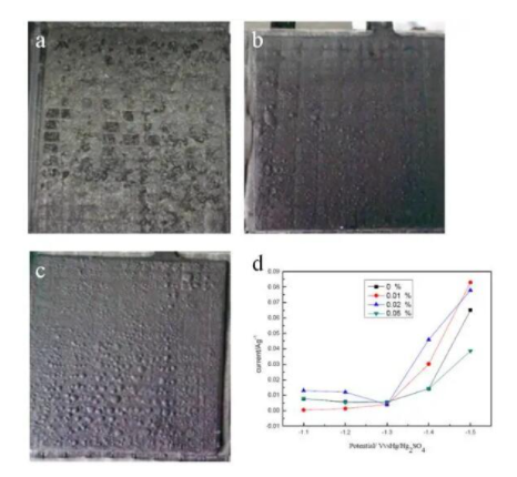 The results showed that for carbon materials with an addition of more than 1.5%, the electrode plate lead paste almost completely peeled off after conventional process formation without the addition of adhesives and inhibitors (Figure 1a), confirming that high carbon content has a significant impact on the structure and properties of the active substances in the electrode plate. When the carbon content is reduced or appropriate adhesives are added, the condition of the electrode plate after formation is significantly improved (Figure 1b and Figure 1c), but it still cannot be completely solved. Adding a hydrogen evolution inhibitor to the electrolyte can be seen from Figure 1d that the hydrogen evolution inhibitor has a promoting effect on hydrogen evolution after 0.02%, and has a significant inhibitory effect at a content of 0.05%. However, during formation, the negative electrode bubbles significantly and cannot be used alone. Corresponding defoamers must be used simultaneously.