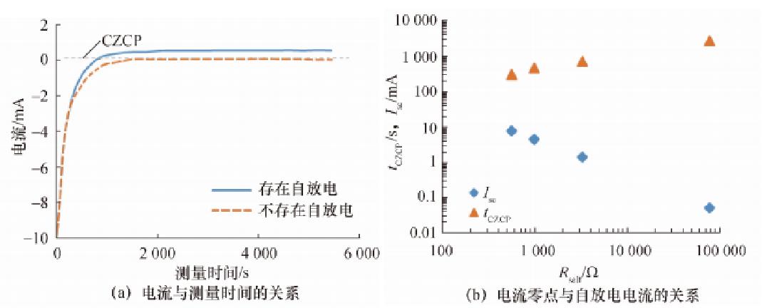 By actively applying a constant voltage, controlling the battery to reach the equilibrium state, and, measuring the current flowing through the circuit during this process, the measurement time can be shortened. In addition, the crossing point (CZCP) where the current is zero can also be used as a parameter to characterize the self-discharge rate. As shown in Figure 3b, the logarithm of tCZCP when the current Isc reaches zero is positively correlated with the logarithm of the self-discharge resistance Rself.