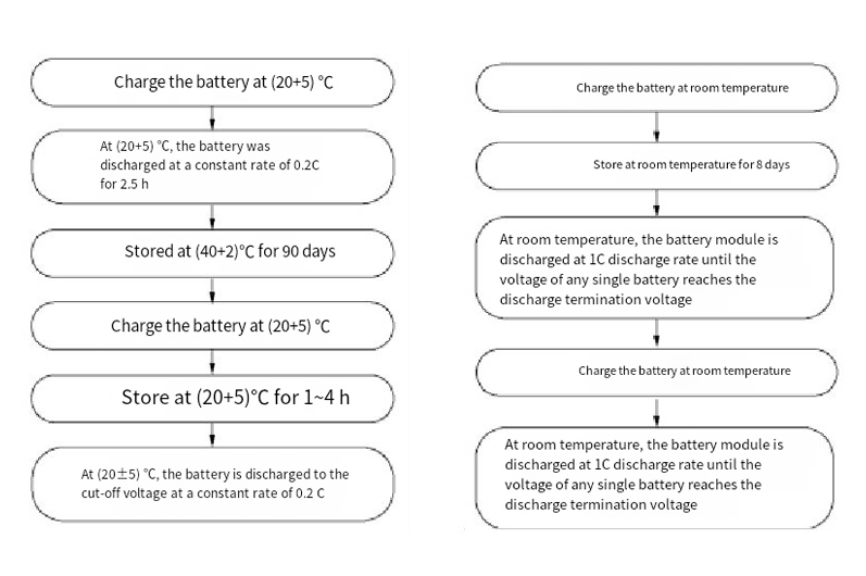 In the battery testing manual issued by the international standardization bodies and relevant government departments and industry associations, the relevant provisions are made for the detection of battery self-discharge through capacity measurement: The International Electrotechnical Commission (IEC) issued "Batteries and battery packs containing alkaline or other non-acidic electrolytes: Portable secondary lithium Batteries and accumulators "(IEC 61960) stipulates that the battery will be in the state of 50%SOC, stored at the ambient temperature of (20±5)℃ for 90 days, and the discharge of the battery after recharging should not be less than 85% of the rated capacity, the specific measurement process is shown in Figure 2a. The battery test manual for electric vehicles issued by the United States Automotive Research Council (USCAR) stipulates that the actual power level corresponding to the operating range of the battery should be measured before measurement. After the battery is discharged at a C/3 ratio of 50% of the available electricity, it is stored at an ambient temperature of 30 ° C for 30 days, and the discharge of the battery is measured after recharging. The "Performance Requirements and Test Methods of power batteries for Electric Vehicles" (GB/T 31486) issued by the Standardization Administration of China is similar to the IEC standard, which stipulates the measurement test process of charge retention and capacity recovery ability. Taking the room temperature test as an example, the battery is stored for 8d at room temperature, the charge retention rate is not less than 85% of the initial capacity, and the capacity recovery is not less than 90% of the initial capacity. The specific measurement process is shown in Figure 2b.