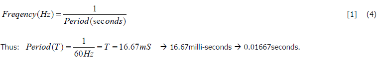 The frequency is how many cycles are completed in 1second. The unit for frequency is (Hz). In the US, ourgrid operates at 60Hz, AKA 60cycles per second. The duration in time of one complete cycle is called theperiod. Typically the frequency is guaranteed +/- 2% (typical +/-0.1Hz). In fact, if the utility spends 15min out of the day sending out 59.5Hz, they will generally try to also spend 15min out of the day at 60.5Hz to make upfor it. Many older analog wall clocks were driven off of the line frequency because the grid generally is just that good.