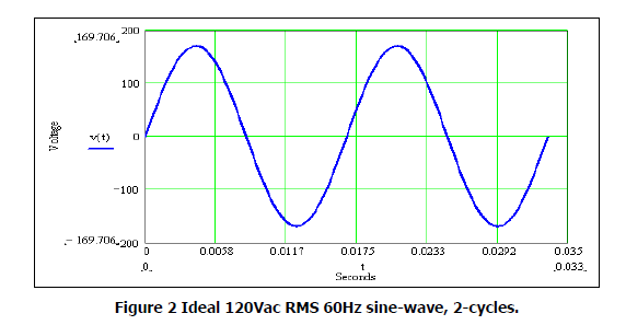 The sine wave above in Figure 2 was generated perfect, containing no harmonics, shown over 2 complete cycles. In casual conversation, Engineer’s hardly ever refer to the sine wave in Figure-2 with Equation (5). It should simply be called a 120VRMS 60Hz sine wave. This is what the voltage coming out of your receptacle athome should look like if viewed on an oscilloscope.