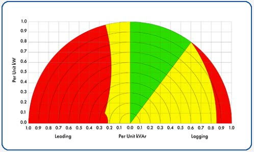 Diesel generator’s safe operating area. Normal operation is shown in green. In the yellow area operation is still possible, on temporary basis. Operation in the red area is not allowed. During UPS start-up, generators must supply pure leading power and the working point is right on the left horizontal axis. Maximum pure leading power limit is typically 0.2 of genset rated power.