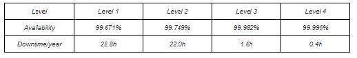In the four different levels of definitions, different requirements for building structure, electrical, grounding, fire protection and telecommunication infrastructure safety are included. Table 2 shows the availability index of the TIA942 standard data center level.