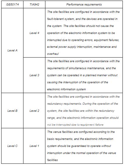 By comparing the availability and redundancy of data centers, we have established a reference relationship between data centers of different levels described in domestic and foreign standards. See Table 3 below.