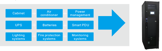 Fully enclosed cabinet has cold and hot aisle, closed structure, near end cooling and air conditioning system. Energy consumption is greatly reduced by using high efficiency modular UPS and flexible configuration.