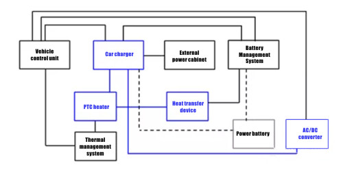 For PTC heater and heat exchanger, when the external temperature is too low, the charging current only flows through the heater, and the rear heat exchanger will heat. The amount is transmitted to the cell, which is in a sleep state before the cell temperature rises to the target temperature. The schematic diagram is as follows: