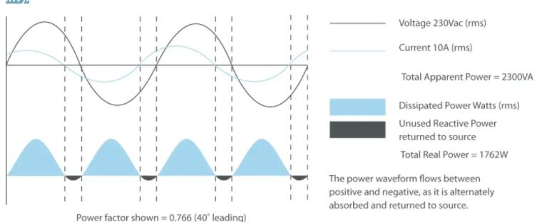 Using the same 2300 VA as in previous examples, a leading pf of 0.766 has a real value of 1762 W (1.76 kW).