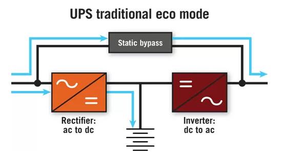 ECO mode is very similar to the basic mode of operation used in an offline UPS where it is called “standby” or “line interactive” mode. In these traditionally smaller, single-phase UPSs, the inverter/rectifier circuits are “offline” standing by, ready to switch on if the power fails or a problem is detected.