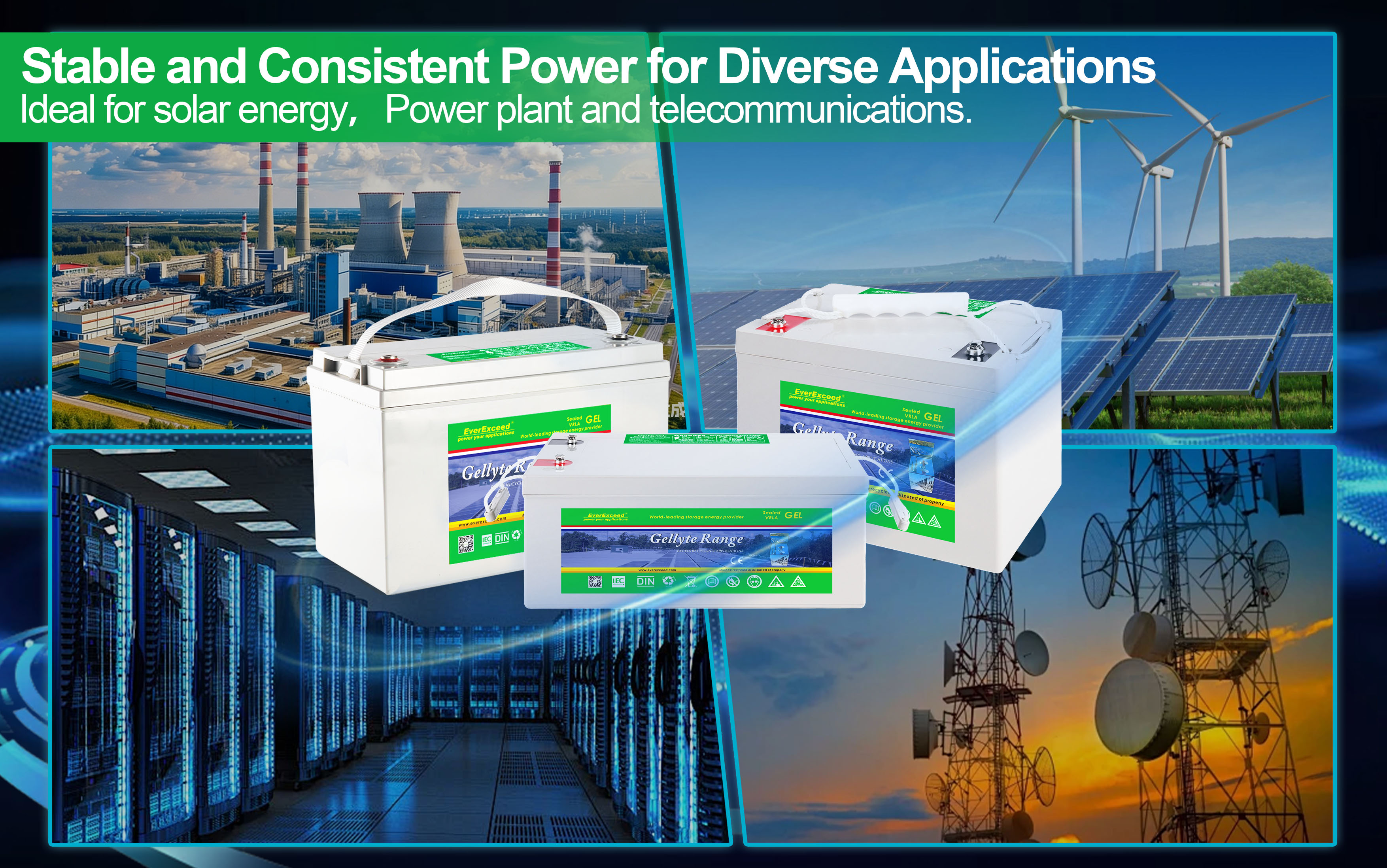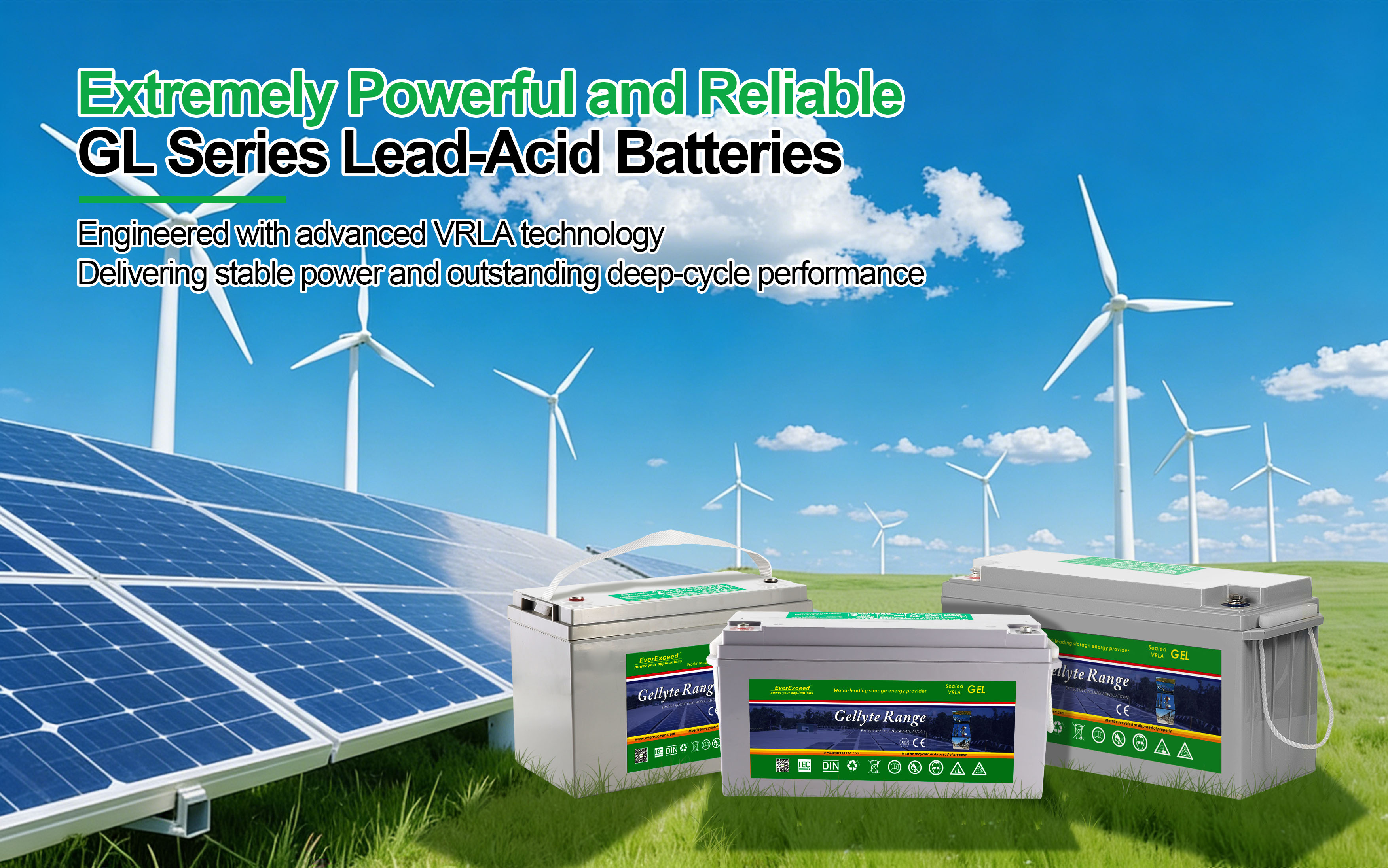 | Can be used in any orientation. Upright, side or end mounting recommended | Advanced Germany technology and the use of the most modern computer-aided design and manufacturing techniques make Everexceed's Gellyte Range Batteries the ideal power solution for your applications | Increased durability and deep cycle ability for heavy-duty applications |
