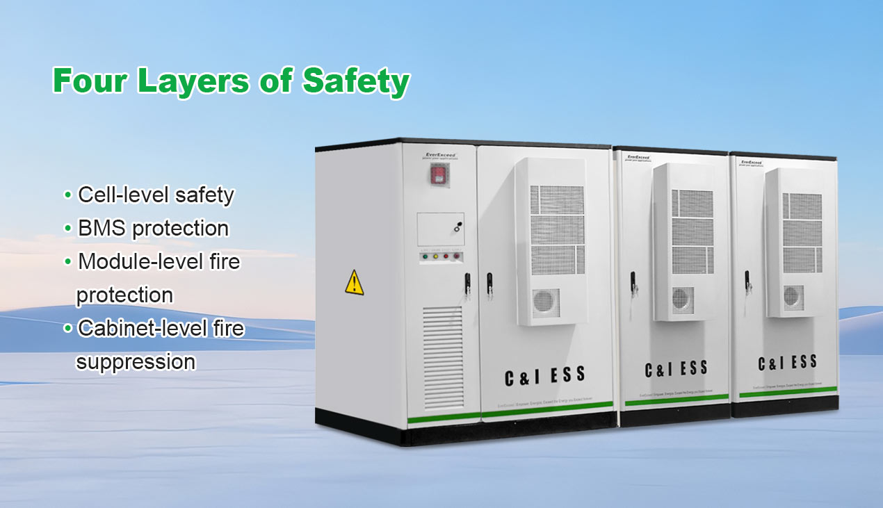 Featuring four layers of safety — including cell-level protection, advanced BMS control, module-level fire protection, and cabinet-level fire suppression — the system ensures comprehensive and reliable operational safety.