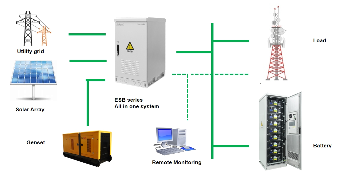 Solar power is a main source during the daytime, while batteries and genset as supplementary sources when the grid is unavailable.