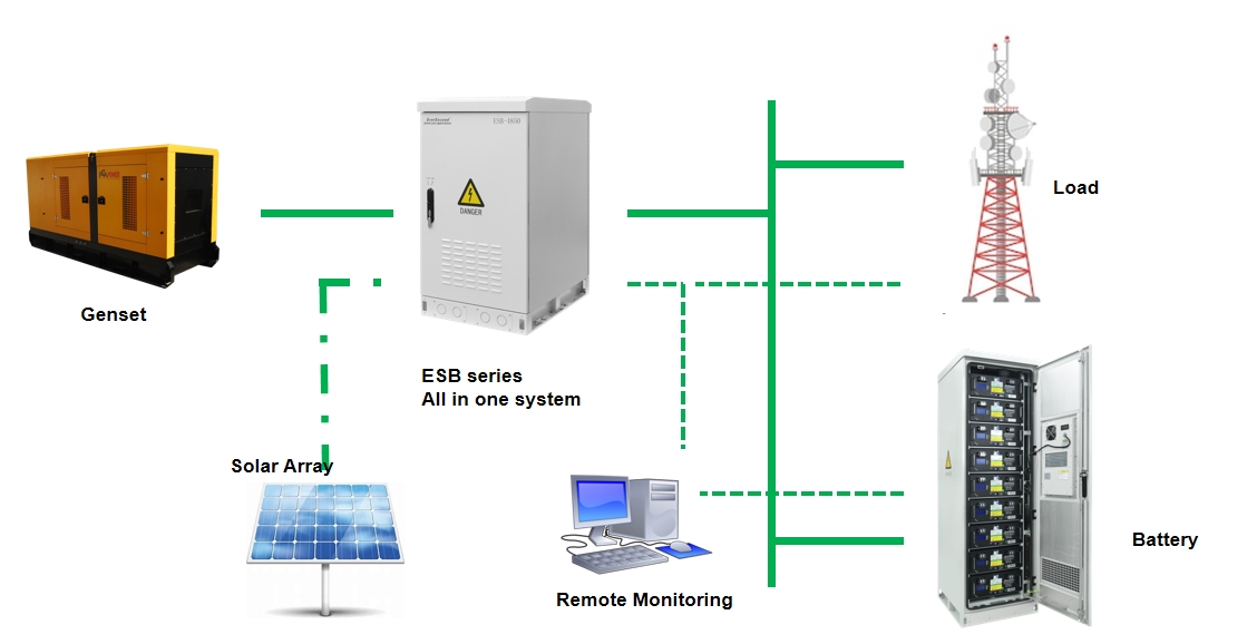 Genset as the primary energy source with fast charging lithium batteries, reduce genset running time and maintenance visits, reduce genset OPEX and optional solar power.