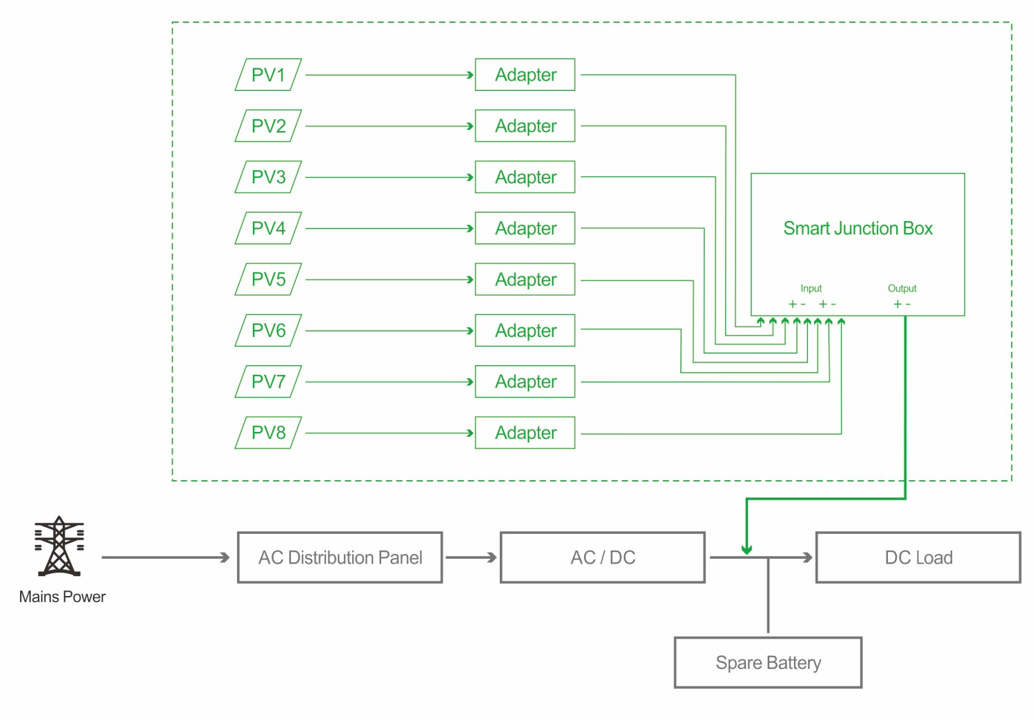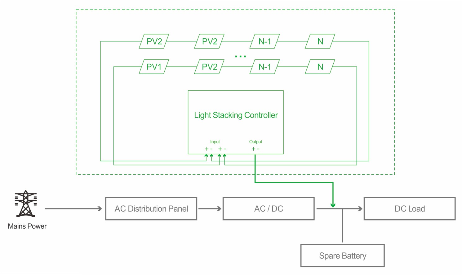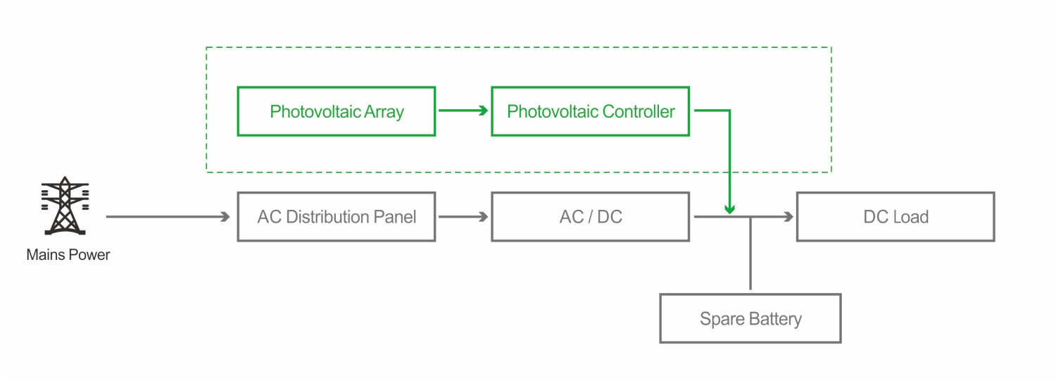PV-Overlay integrates an additional photovoltaic system into the existing power architecture of a telecom base station, enabling hybrid “PV + Utility Grid” energy supply.